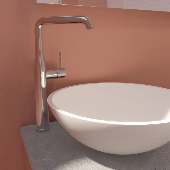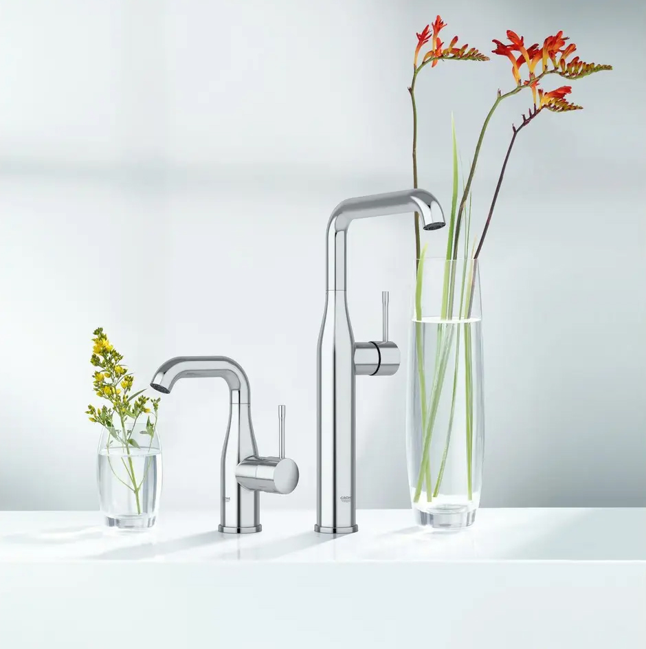 Επικαθήμενη αναμεικτική μπαταρία νιπτήρος της σειράς Essence New, με υψηλό ρουξούνι, από την Grohe.