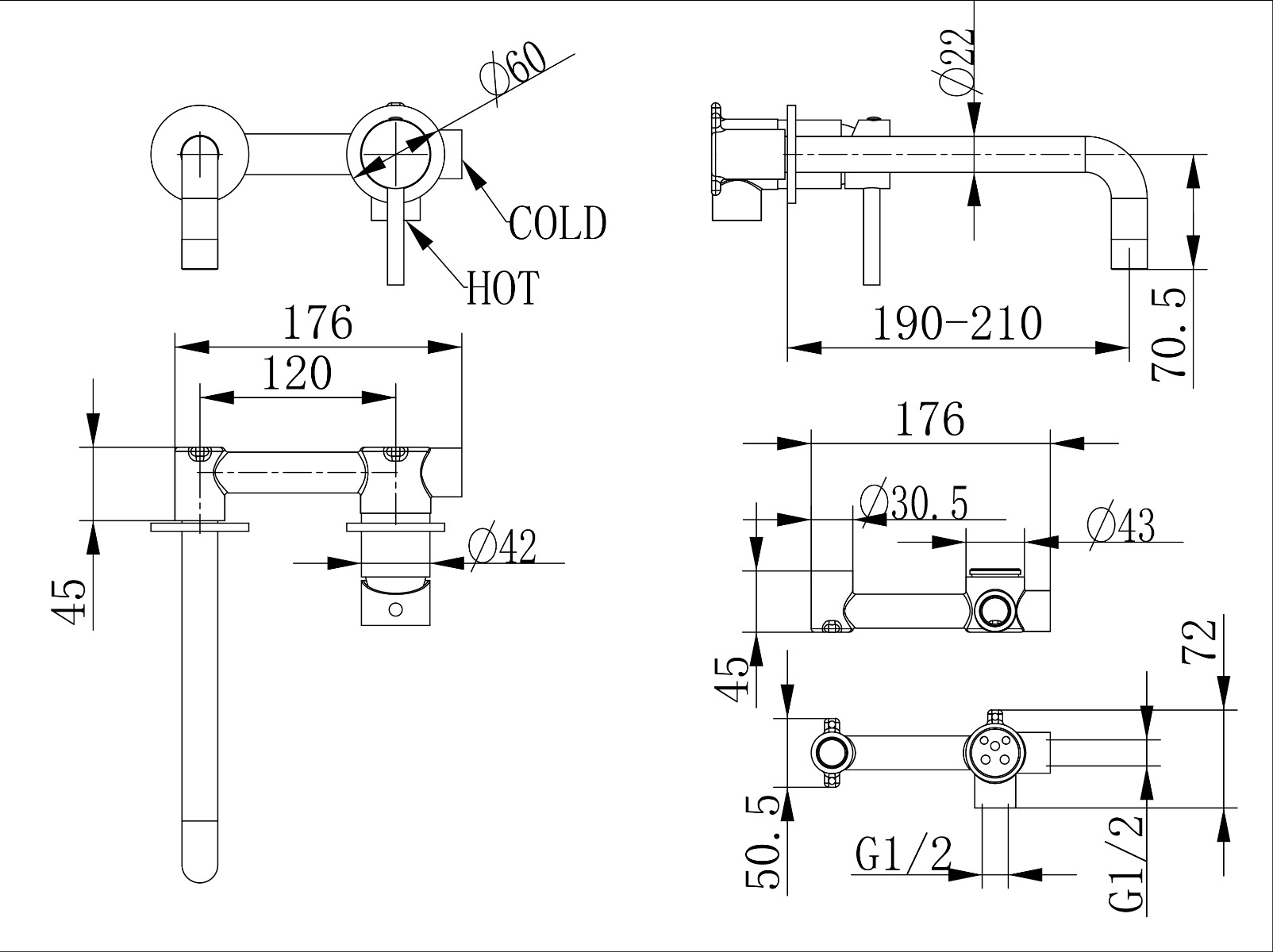 Μπαταρία νιπτήρος τοίχου ΜΜ εντοιχιζόμενη Brushed Matt Black Piccadilly.