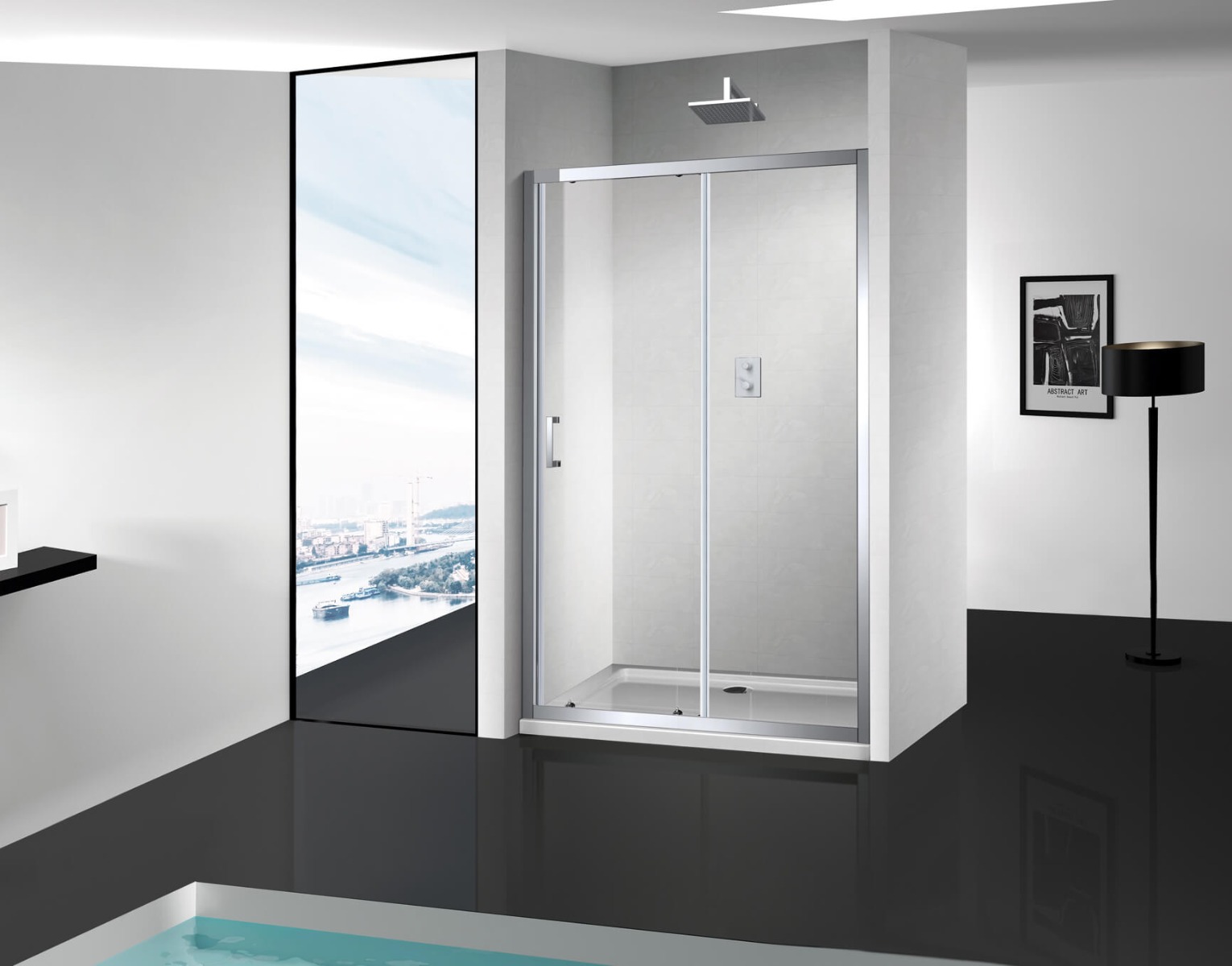 Κρυστάλλινη καμπίνα ίσια, συρόμενη, για τοποθέτηση ανάμεσα στον τοίχο.
