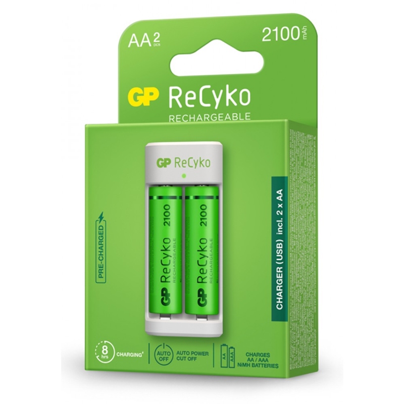 GP Recyko φορτιστής USB με 2 επαναφορτιζόμενες μπαταρίες AA 2100mAh.
